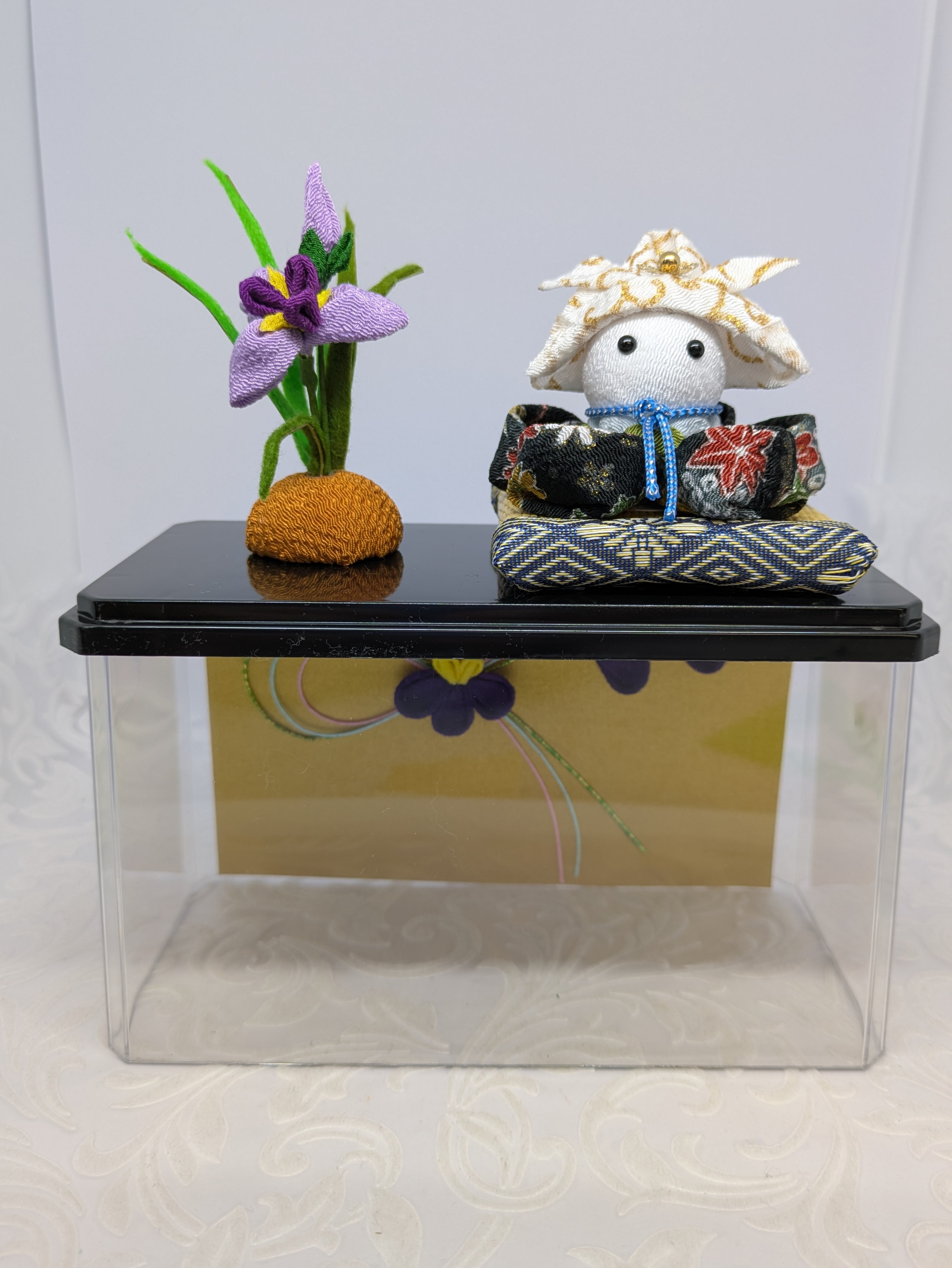 幅約16.5cm奥行7.5cm高さ約10cmのケースに入った五月人形は、端午の節句を華やかに彩る特別なアイテムです。細かな作り込みと菖蒲が添えられ、室内に温かい雰囲気をもたらすことでしょう。この飾りは、ケース入りなので お掃除も簡単でリビングや玄関にぴったりの一品です。また ケースを空けてその上に乗せて飾る事も出来ます。