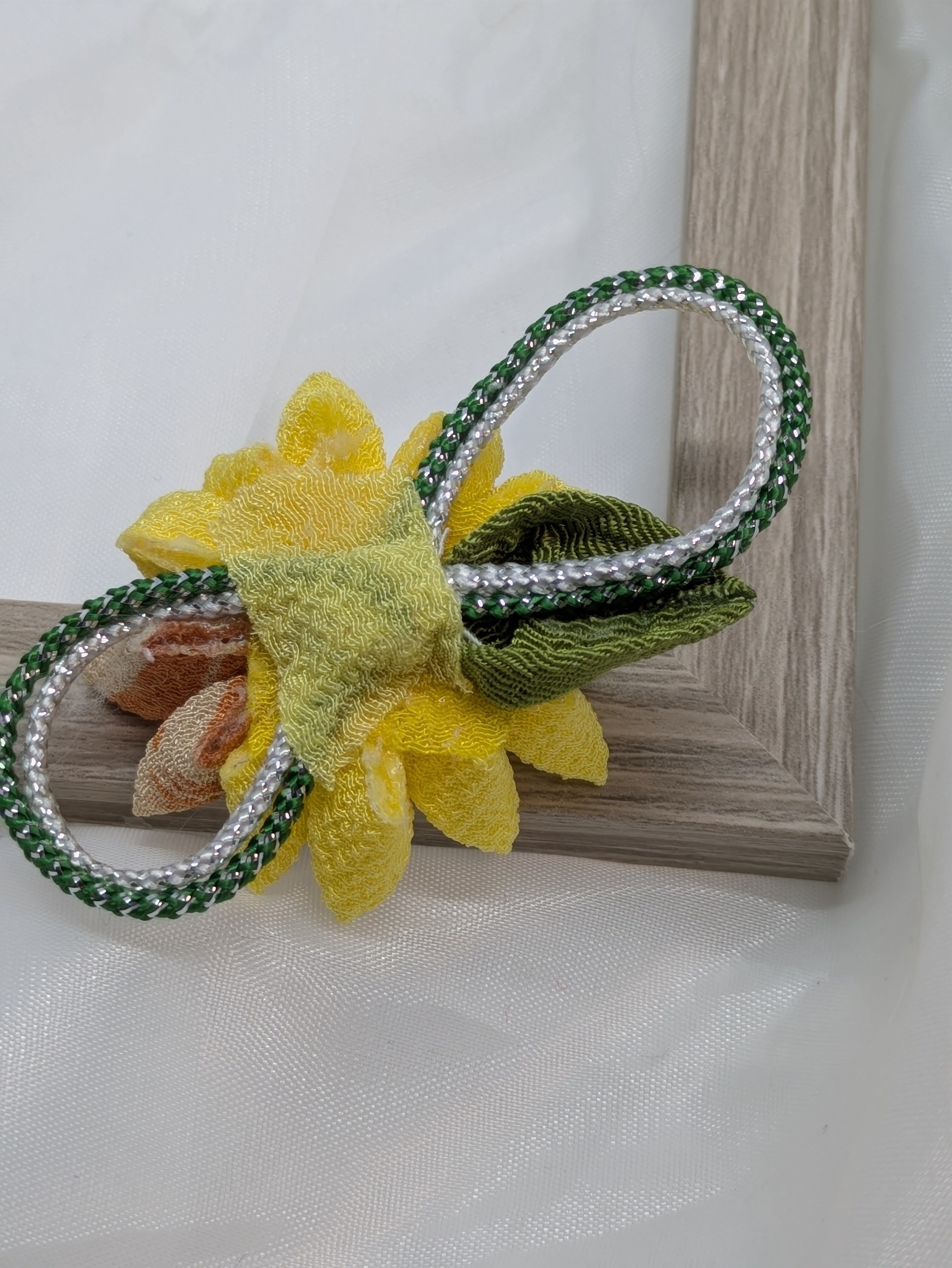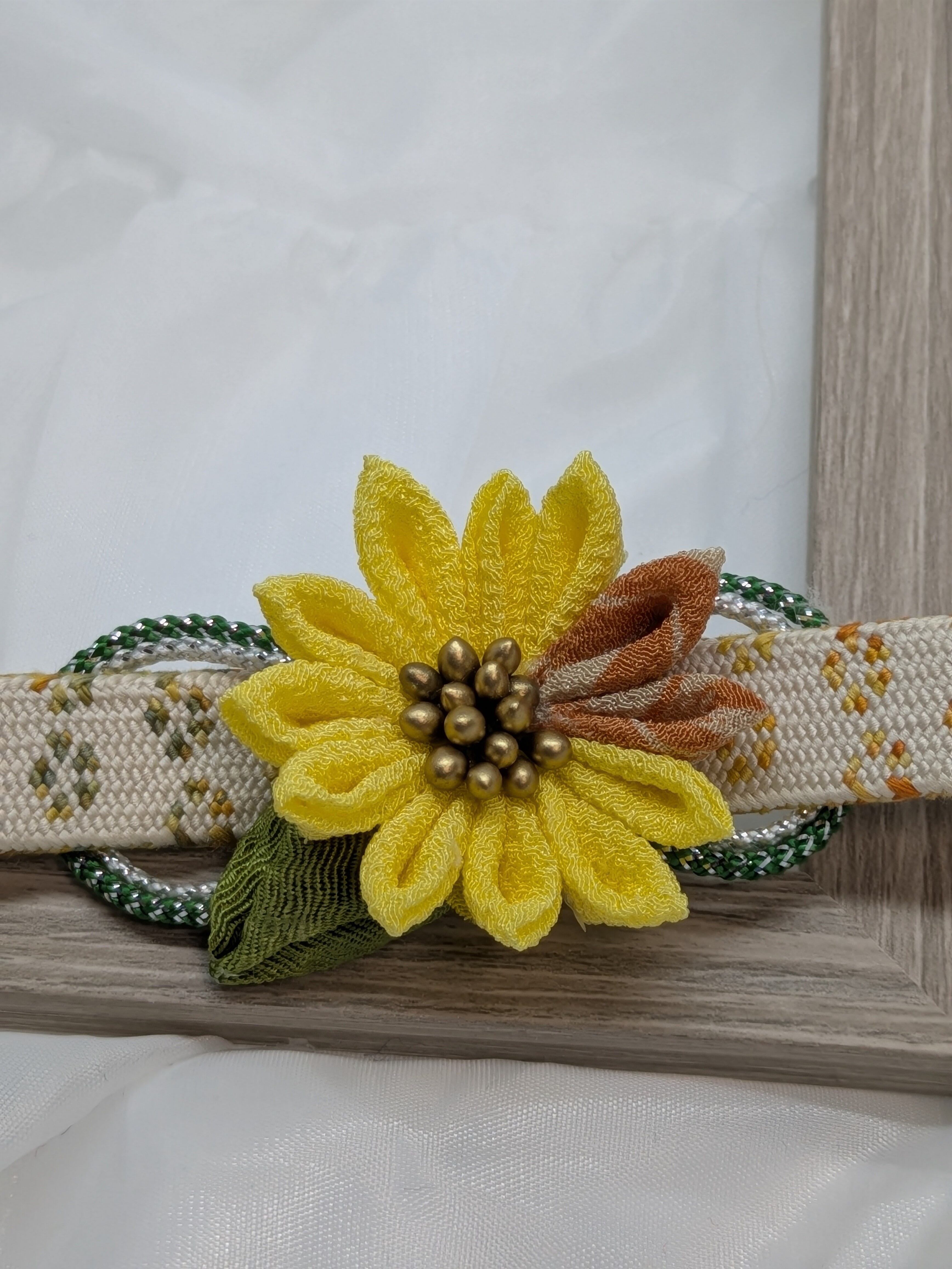 水分や圧力には敏感ですので、取り扱いには十分ご注意ください。直射日光に長時間当たると色あせる恐れがありますので、ご理解いただければ幸いです。返品交換は承っておりませんので、何卒ご了承くださいますようお願い申し上げます。心を込めてお作りした「つまみ細工 帯留め ひまわり」を、ぜひお手元にお迎えください!
