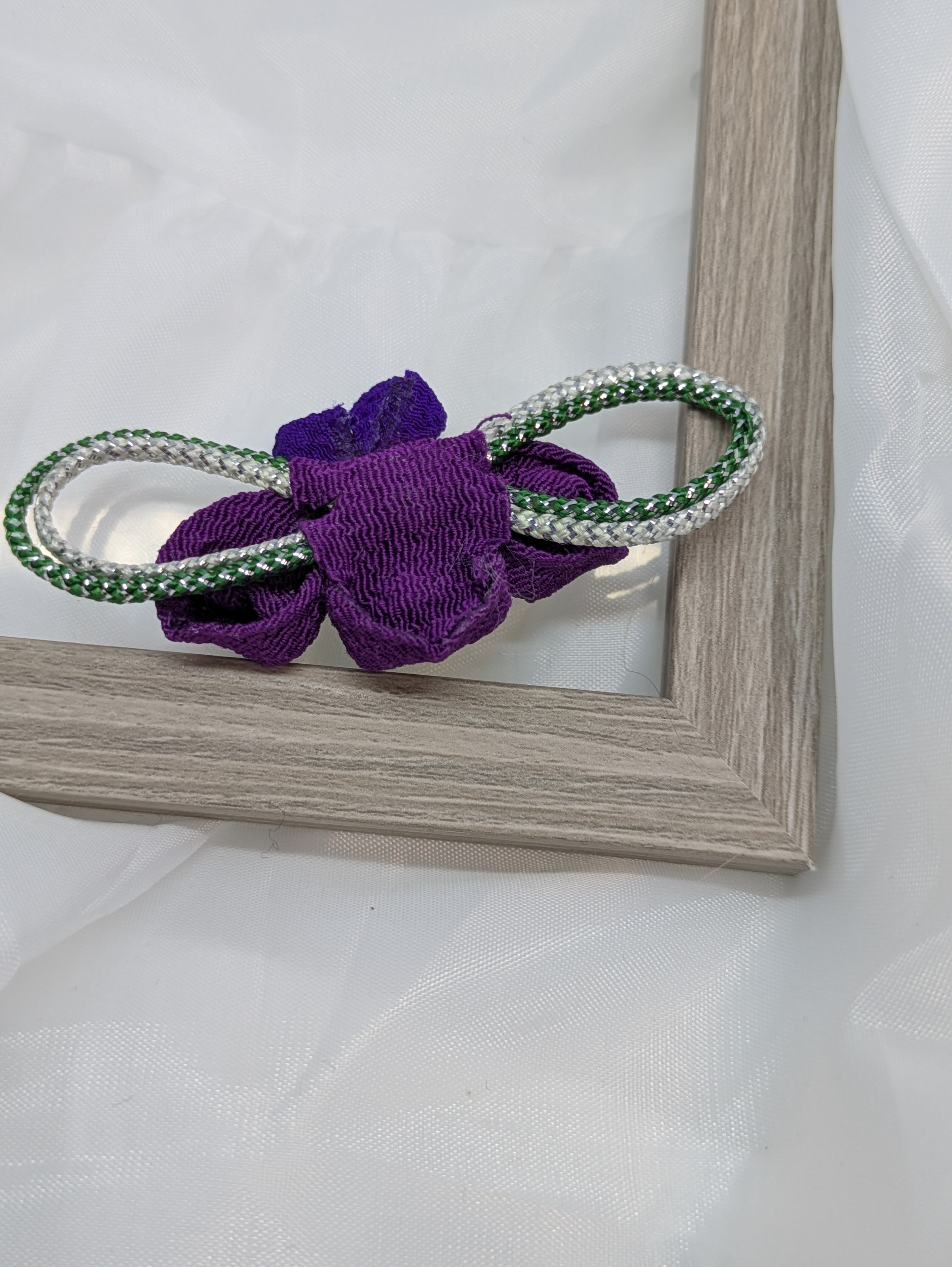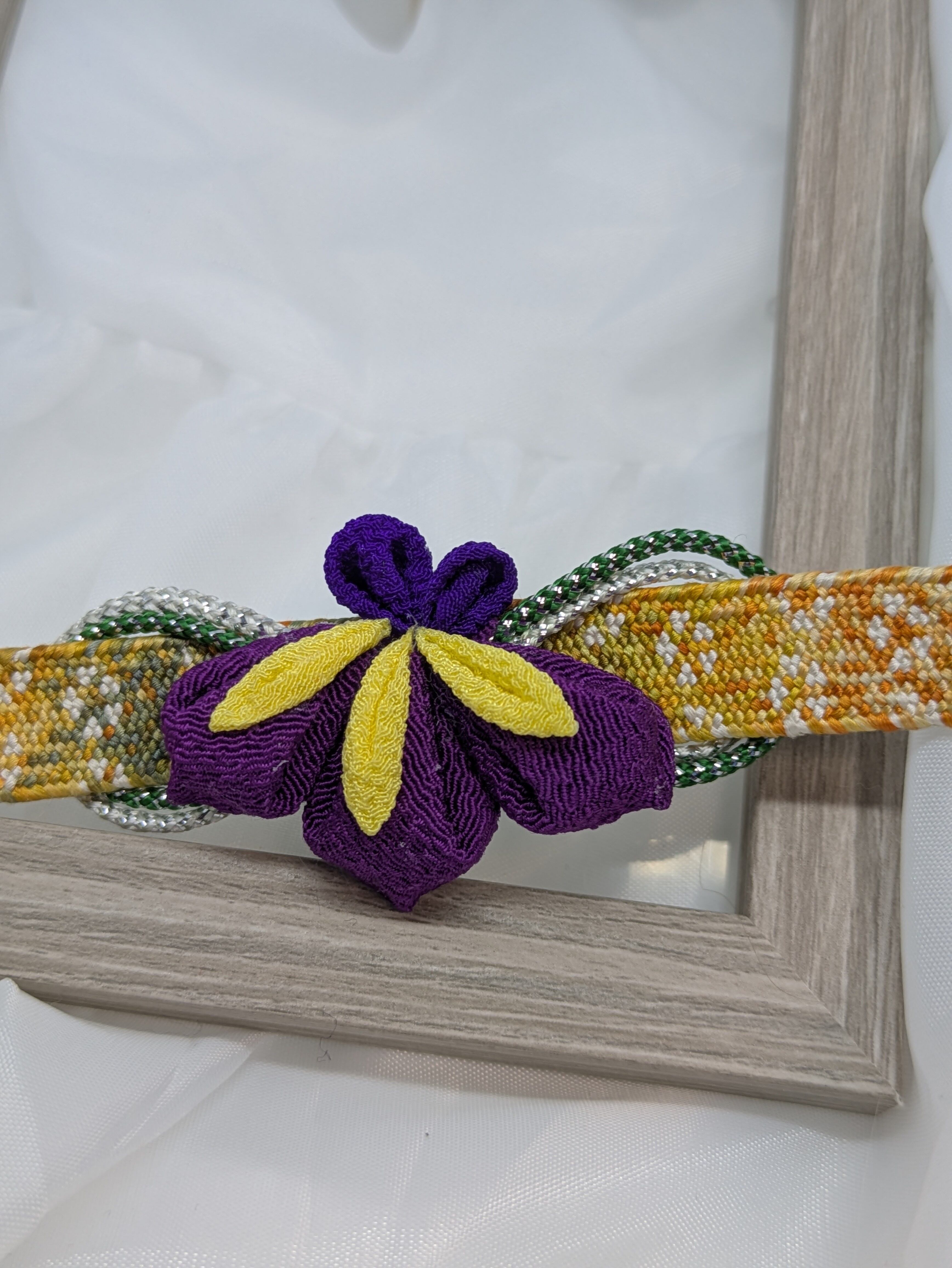 水分や圧力には敏感ですので、取り扱いには十分にご注意ください。直射日光に長時間当たることは色あせの原因となりますので、その点をご理解いただければと思います。返品交換はお受けしておりませんので、何卒ご了承のほどお願い申し上げます。心を込めてお作りした「つまみ細工 帯留め 菖蒲一輪」を、ぜひお手元にお迎えください!