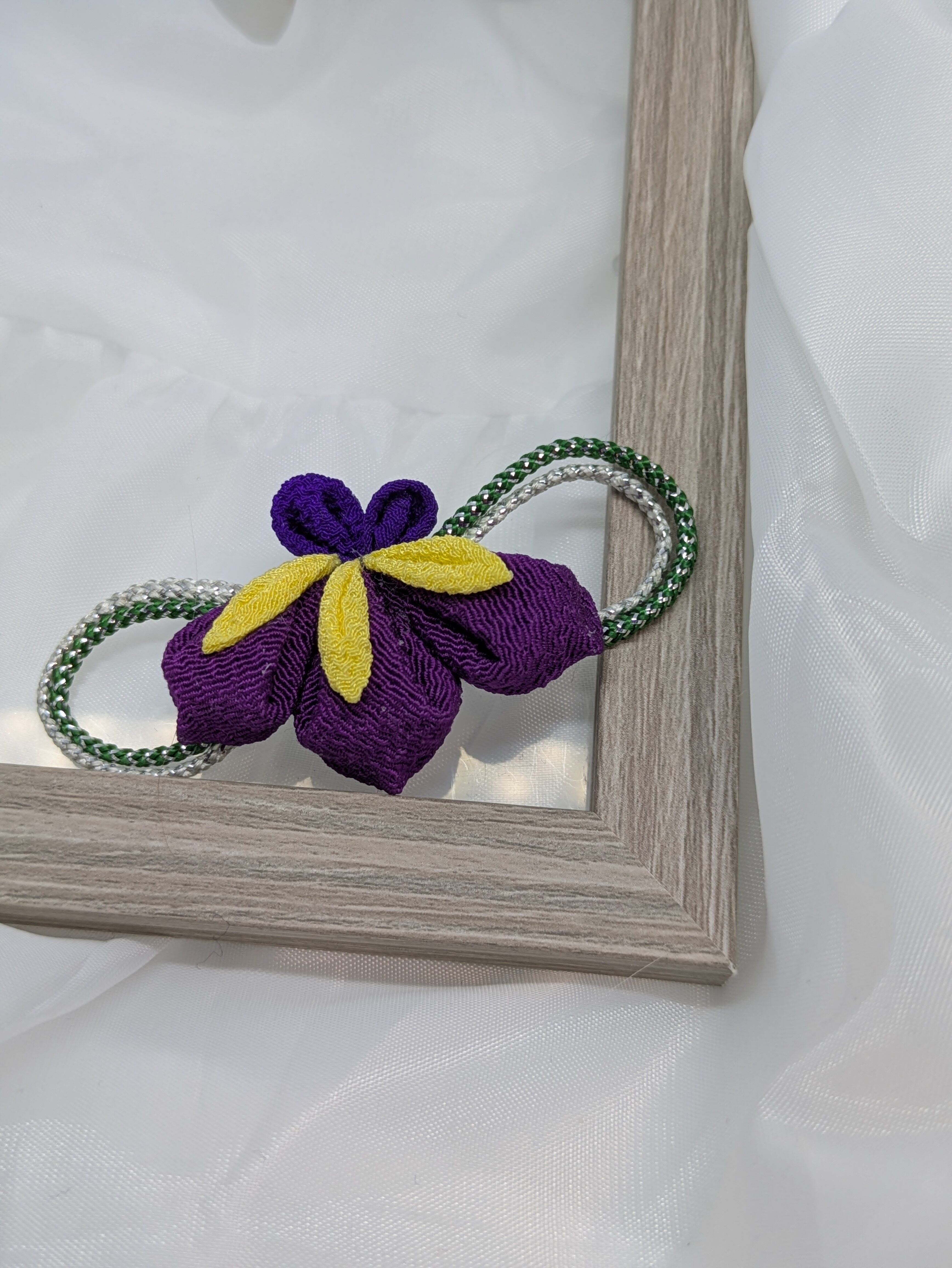 ■「つまみ細工 帯留め 菖蒲一輪」は、和装スタイルに美しさをプラスするアイテムです。花の直径は約3cm、横幅は約7cmで、さまざまな帯締めに自然にフィットし、金具を使用しないため安定感も抜群です!また、帯締が通る部分にかんざしをさすことで、和装だけでなく洋服にもぴったりな髪飾りとしても楽しむことができます。